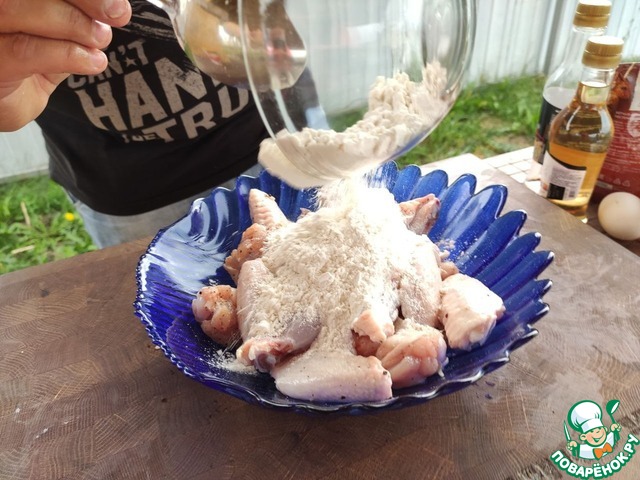 Все тщательно перемешать. Кляр должен полностью покрывать курицу.