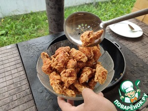 Курицу необходимо обжарить дважды, дав ей отдохнуть 5-6 минут между подходами. Двойная обжарка обеспечивает максимальный хруст панировки.