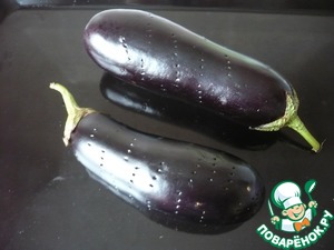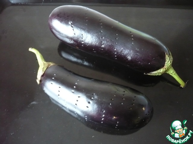 Баклажаны наколоть вилкой и запечь в духовке до мягкости при температуре 180 градусов ~ 45 минут. Дать баклажанам остыть, затем очистить их от кожуры.