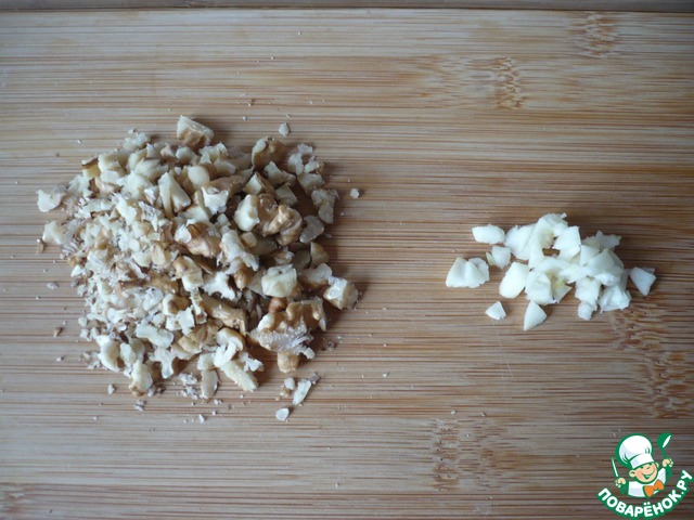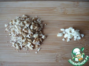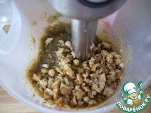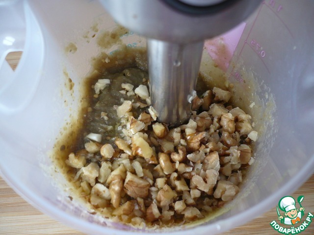 Измельчите с помощью погружного блендера очищенные баклажаны, нарубленные грецкие орехи, чеснок и оливковое масло.