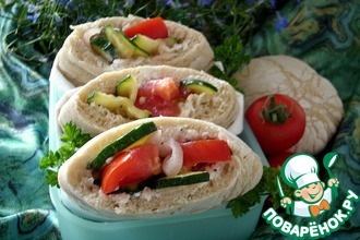 Сверху посыпать мелко нарезанной зеленью укропа, украсить помидоркой - черри. Таким же образом украсить остальные сэндвичи.