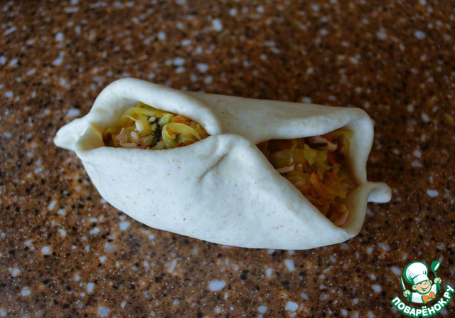 Защипнуть в трёх местах. Далее защипнуть полностью, формуя пирожок.