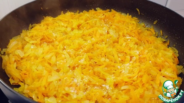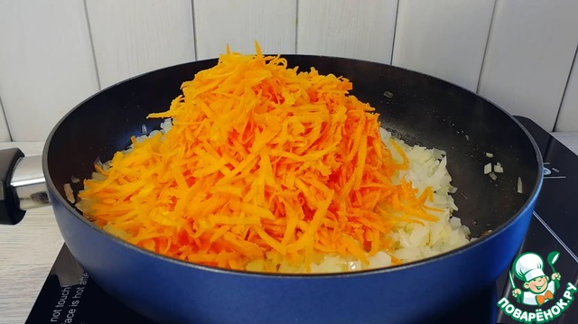 Добавить морковь. Обжаривать 3-4 минуты до мягкости овощей.
