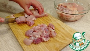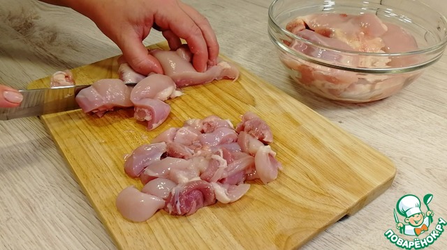 Подготовить курицу. Мякоть бедра нарезать на кусочки среднего размера.