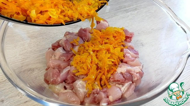 К курице добавить обжаренные овощи.