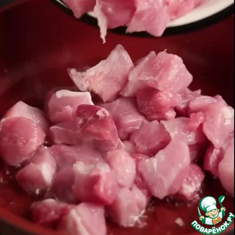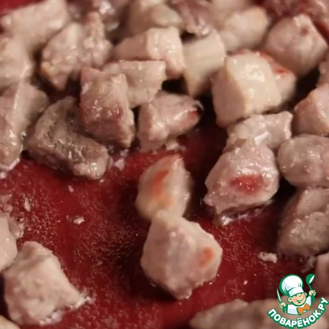 Все ингредиенты нарезать на небольшие кубики. На сковороде разогреваем масло и выложить мясо.