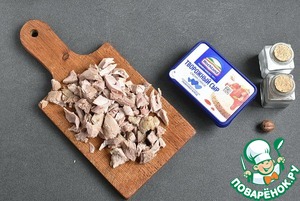 1. У меня была уже готовая отварная голень индейки. Вы можете отварить голень с добавлением лука и моркови в подсоленной воде до мягкости мяса. Затем охладите, снимите мякоть и нарежьте кусочками.