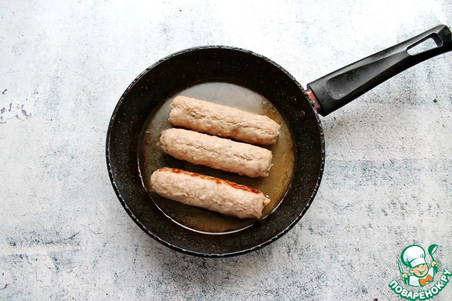 На сковороду налейте растительное масло, разогрейте и обжарьте купаты на медленном огне под крышкой. На это ушло примерно 5 минут, купаты должны стать твердыми.