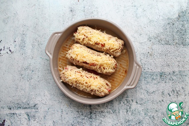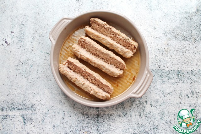 Разрежьте купаты вдоль, не прорезая их до конца. Разверните купаты и уложите в смазанную форму для запекания.