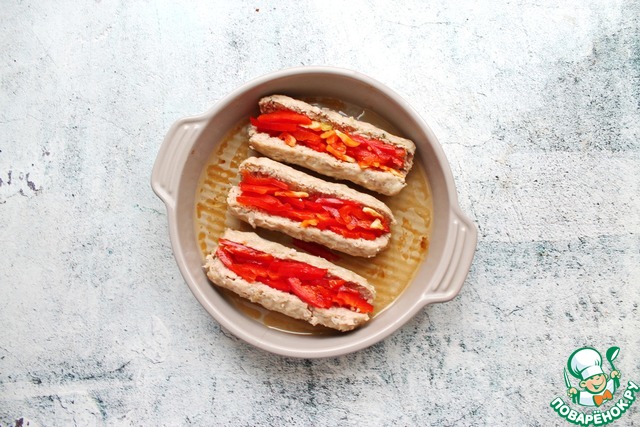 У болгарского перца удалите плодоножку и семена, порежьте тонкой соломкой и распределите внутри разреза.