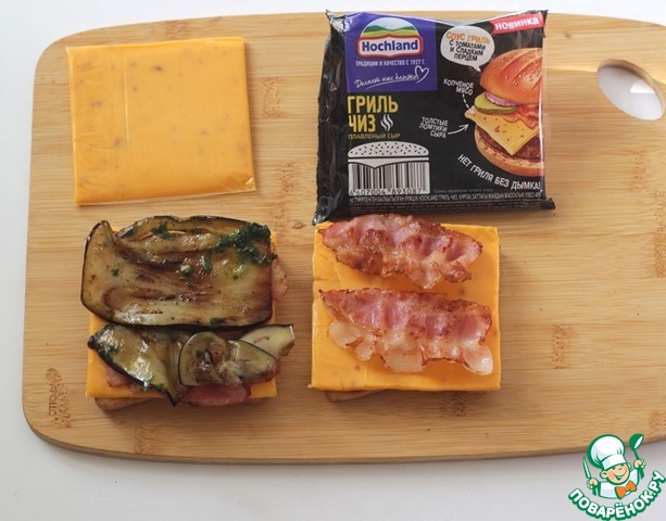 Обжарьте хлеб на оставшемся масле и выложите на хлеб по ломтику плавленого сыра гриль чиз от ТМ Hochland, обжаренный бекон, баклажан.