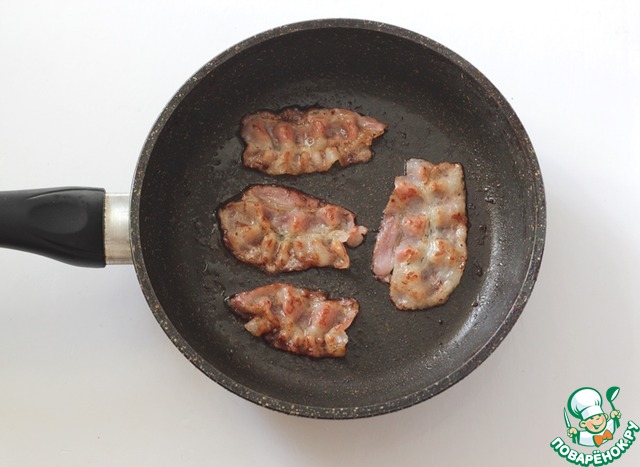 На сковороде обжарьте полоски бекона до легкой золотистости. Обжаренный бекон переложите на тарелку.