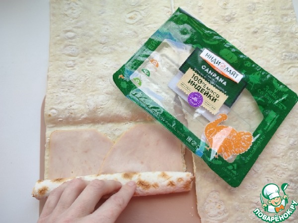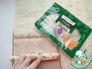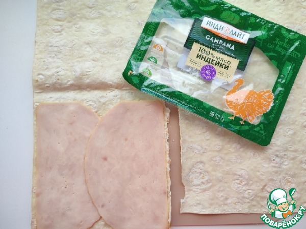 Выкладываем пласты ветчины на лаваш (у меня получилось два таких рулета).