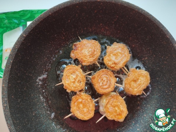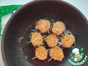 Плотно сворачиваем в трубочку. Разрезаем на части и фиксируем зубочистками.