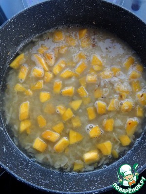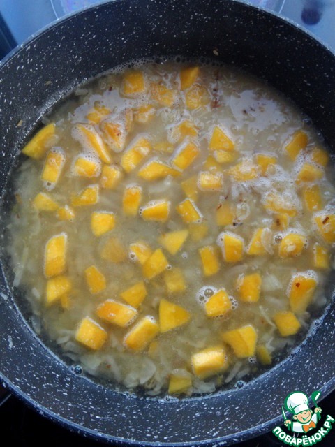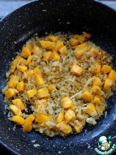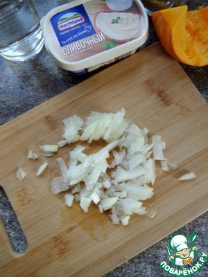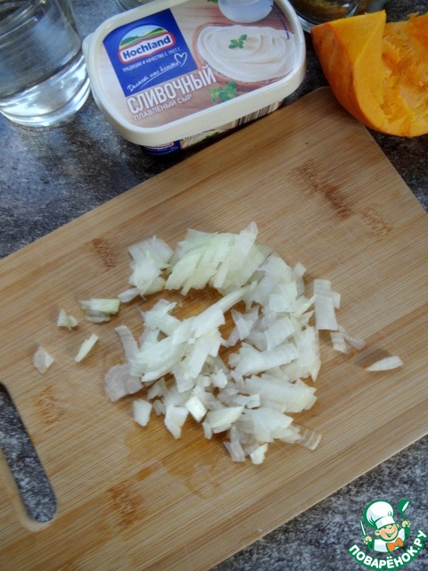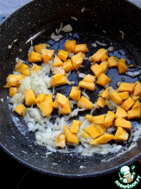 Нарезать мелко лук и некрупными кубиками тыкву.