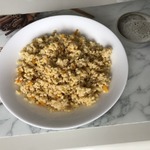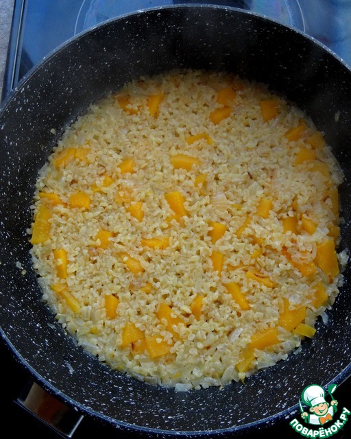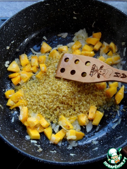 Пожарить всё вместе примерно минуту. Булгур должен немного поджариться.