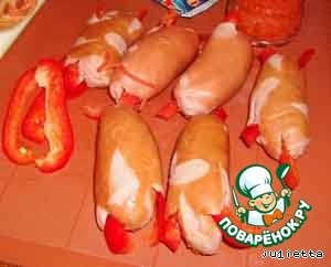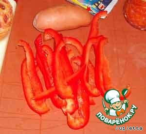Сардельки зачистить от пленки, паприку нарезать тонкой соломкой.