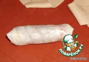 Завернуть в лист шпигованную сардельку.