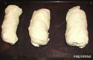 Затем завернуть сардельки в ленты теста, уложить на смазанные растительным маслом противни на некотором расстоянии друг от друга.