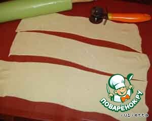 Тесто тонко раскатать, стараясь не возвращать скалку по тесту. У меня в упаковке было 2 пласта. Я каждый пласт разрезала на 3 полоски.