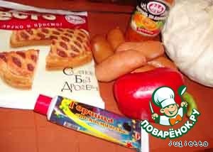 Ингредиенты для «Сардельки, шпигованные овощами, в слоеном тесте»: