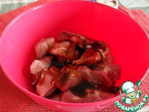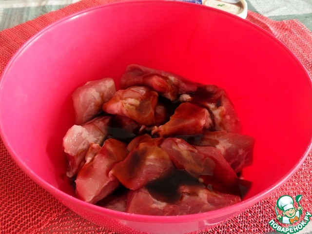 Мясо нарезаем крупным кубиком. Выкладываем в миску. Добавляем соевый соус. Перемешиваем и оставляем на 30 минут.