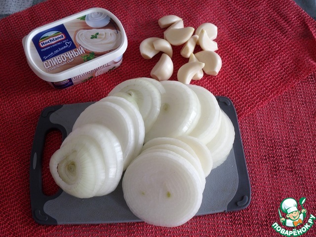 Очищаем и нарезаем кольцами репчатый лук. Очищаем чеснок.