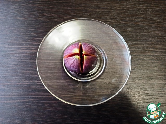 Инжир вымыть, обсушить и сделать крестообразный надрез сверху, но не прорезая насквозь.