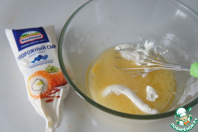 Для глазури смешать творожный сыр Hochland, цедру, сахарную пудру и сок.