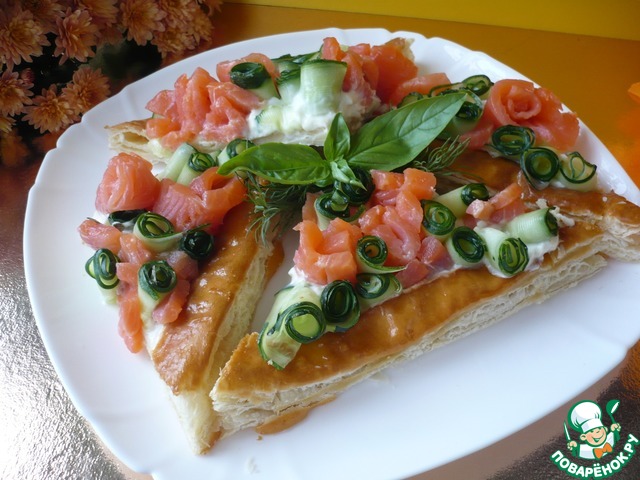 Основа для этой закуски готовится очень просто и быстро. Для этого я покупаю замороженное бездрожжевое тесто и выпекаю его в духовке. А в качестве начинки использовала плавленый сливочный сыр ТМ "Хохланд", свежие огурцы и филе слабосолёной форели. Количество и разнообразие ингредиентов в начинке можно изменять по своему вкусу. Рекомендую приготовить очень простую в приготовлении, вкусную и красивую закуску.