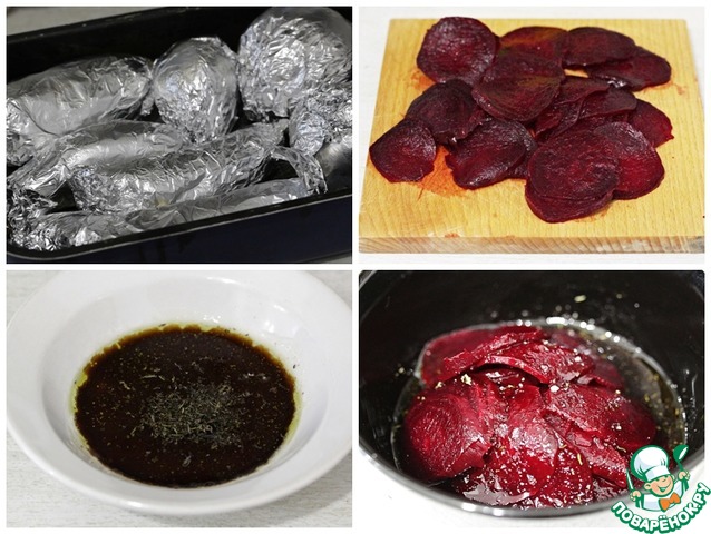 Заранее запечь свёклу в фольге и дать ей остыть, после чего очистить от кожицы и и нарезать на максимально тонкие кружочки.