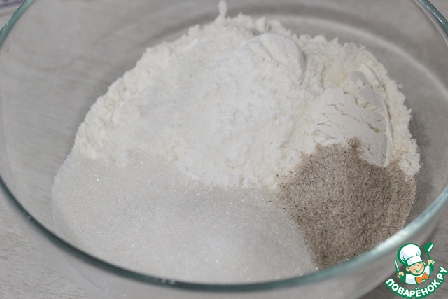 В глубокой миске смешать сухие ингредиенты: муку, разрыхлитель, соль, обычный и ванильный сахар.