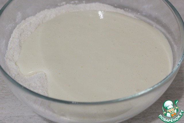Влить жидкую смесь в мучную.