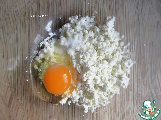 Для теста смешайте творог, яйцо, растительное масло и соль.