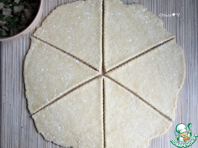 Отдохнувшее тесто раскатайте в круг, диаметром 26-28 см, разрежьте на 6 частей.