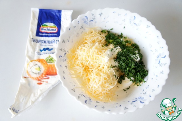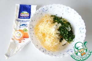 Творожный сыр сложить в чашу, добавить мелкорубленную зелень, тёртый полутвёрдый сыр. Соль, перец, чеснок через пресс по вкусу.