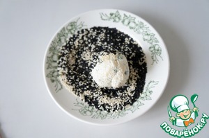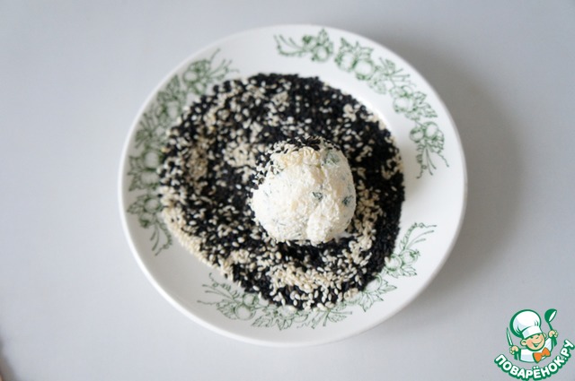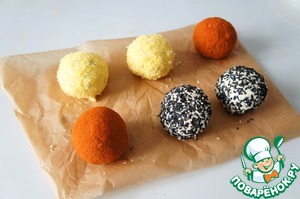 Обкатать шарики в кунжуте, в паприке, в крошке от чипсов.