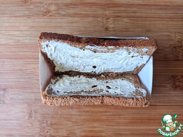 Складываем тост пополам и кладем в бумажную формочку, смазываем его майонезом.