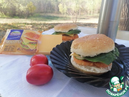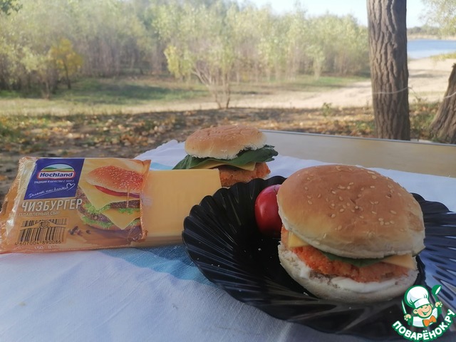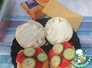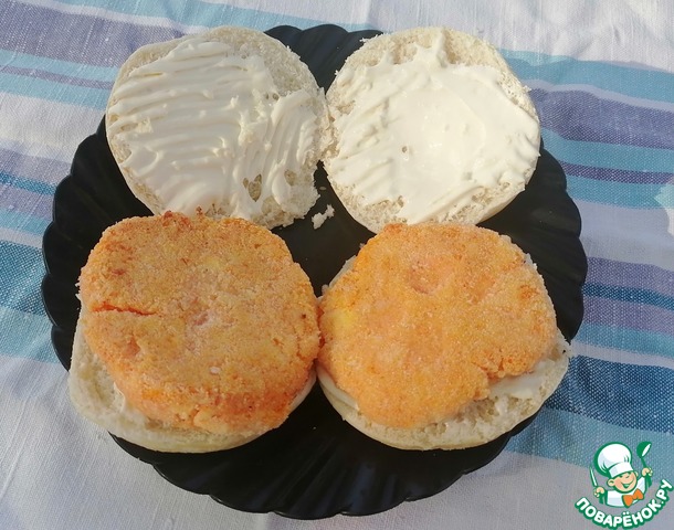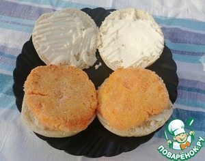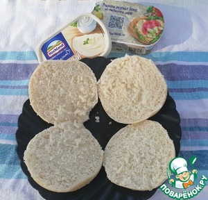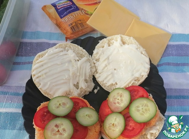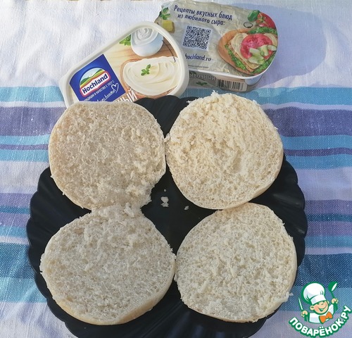 • Булочки для бургеров разрезать, смазать обе половинки плавленным сыром