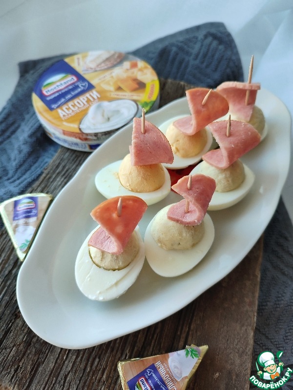 Дополнительно украшаем (усытняем))) яйца кусочком колбаски.
