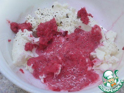 Свежую или размороженную клюкву размять и протереть к творожному сыру. Поперчить и перемешать.