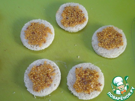 Из ломтиков батона вырезать кружочки диаметром 3-4 см (или квадратики) и смазать их горчицей.
