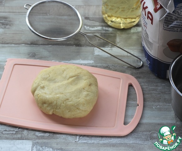 В ковшик наливаем воду и подсолнечное масло, ставим на огонь, доводим до кипения и сразу вливаем в муку, быстро замешиваем тесто. Тесто мягкое и эластичное. Заворачиваем в пищевую пленку и убираем в холодильник на 30 мин. -