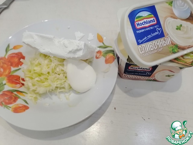 Смешать кабачок с мелко нарезанным укропом, творогом, плавленым сыром, измельченным чесноком, солью