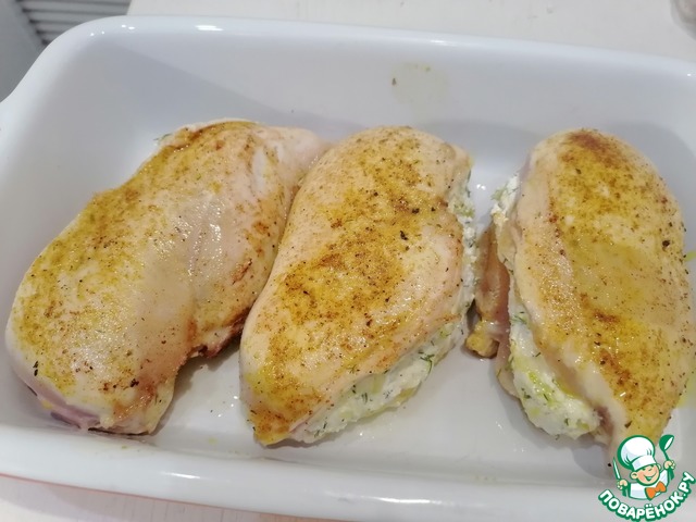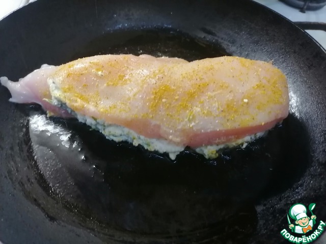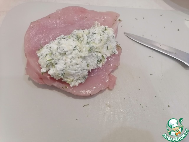Филе натереть солью и специями, сделать разрез и в получившийся кармашек положить начинку. По желанию можно закрепить зубочисткой