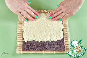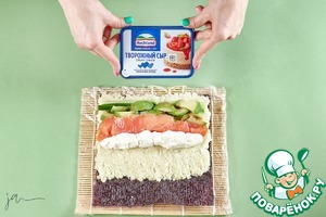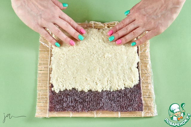 Специальную циновку обмотать пищевой пленкой. Лист нори положить на циновку шершавой стороной верх. Отступить от края примерно два сантиметра. Выложить рис. Из указанного количества получилось ровно две порции.