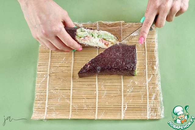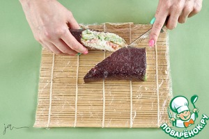 С помощью циновки свернуть в рулет. В отличие от роллов, которым обычно придается кубическая форма, здесь будет овальная, как у шаурмы. Свободный край смочить водой и склеить. С помощью острого ножа, смоченного водой, разделить на две порции по диагонали.