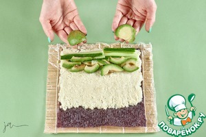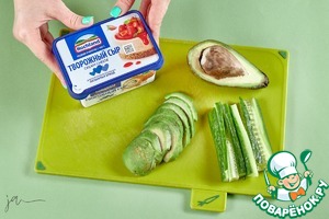 Дальше выложить огурцы и авокадо.