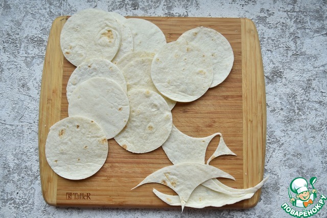 Из больших лепешек вырезаю мини версии лепешек. Формой мне служит стакан, подходящего диаметра. Из одной лепешки вырезаю три мини тортильи. Обрезки тортильи можно использовать для приготовления чипсов.