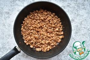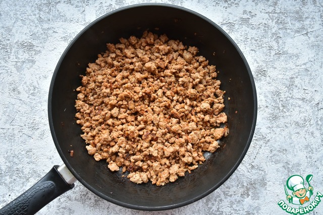 Для мясной начинки разогреваю в сковороде растительное масло и обжариваю до золотистости измельченный репчатый лук, добавляю фарш из индейки "Индилайт" и обжариваю, разбивая комочки деревянной лопаткой.
